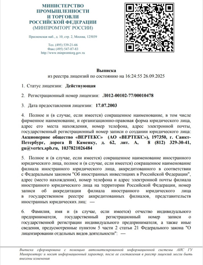 Соответствие производства лекарств компании стандарту GMP документально подтверждено. «ВЕРТЕКС» одним из первых в России получил соответствующие заключения Минпромторга РФ в 2015 г. В 2020 году компании были выданы актуализированные заключения.В 2024 году "ВЕРТЕКС" получил сертификаты GMP ЕАЭС.