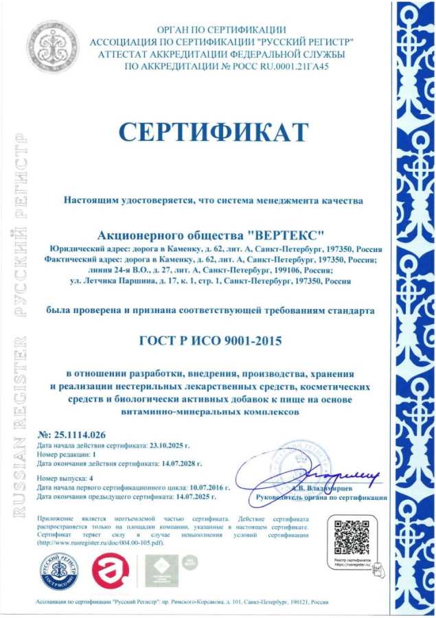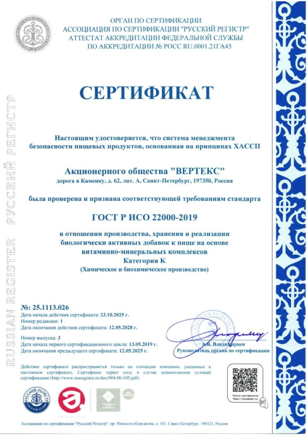 В 2025 году после прохождения ресертификационного аудита "ВЕРТЕКС" получил новые сертификаты соответствия требованиям стандарта ГОСТ Р ИСО 22000-2019 «Системы менеджмента безопасности пищевой продукции. Требования к организациям, участвующим в цепи создания пищевой продукции» (производство, хранение и реализация биологически активных добавок)